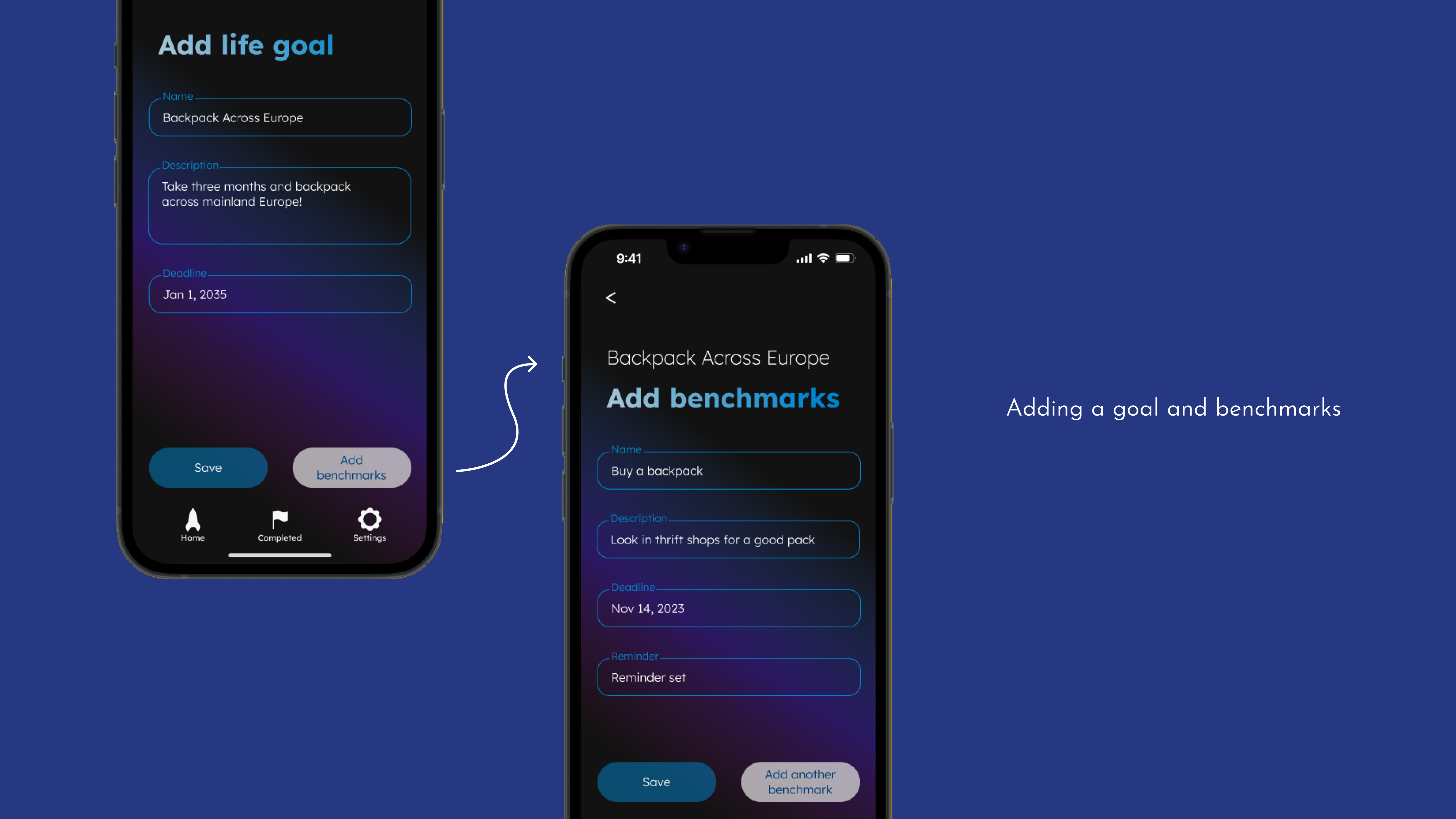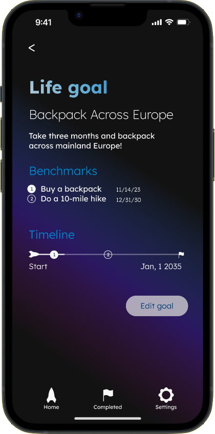 Throughout the design process I balanced attractive and satisfying aesthetics with intuitive functionality. I ultimately landed on an interface featuring cool, celestial colors and a clean, simple input system which guides the user through setting goals and sub-goals and putting them on a path to success.